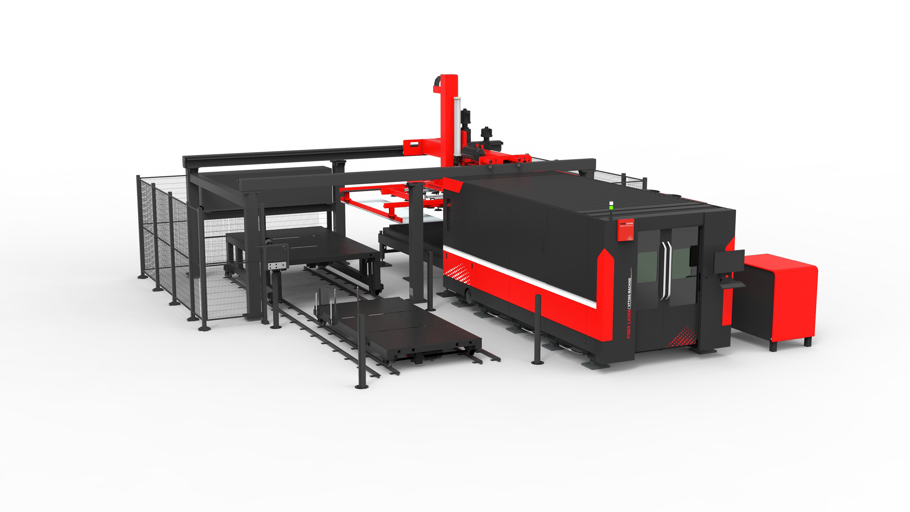 從工作流程上看,D-Cell 激光自動(dòng)化單元將原料首先由原料臺(tái)運(yùn)送至交換區(qū),隨后真空吸盤升降機(jī)迅速而安全地吸取原料(過程中原料下方設(shè)有叉齒保護(hù)以防滑落),并平穩(wěn)地將其移至切割機(jī)工作臺(tái)上釋放。完成切割后,激光切割機(jī)的交換臺(tái)自動(dòng)將原材料與廢料進(jìn)行替換,接著升降梯下降至廢料下方,利用又齒精準(zhǔn)承接廢料,隨后將其運(yùn)送回交換區(qū),并最終平穩(wěn)放置在廢料平臺(tái)上。